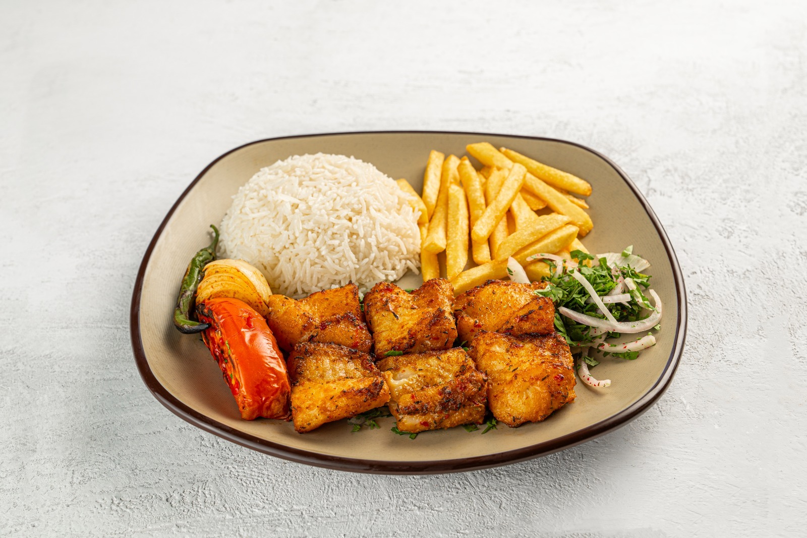 2 skewers of Grilled Fish fillet cubes, Served with white rice, and French fries