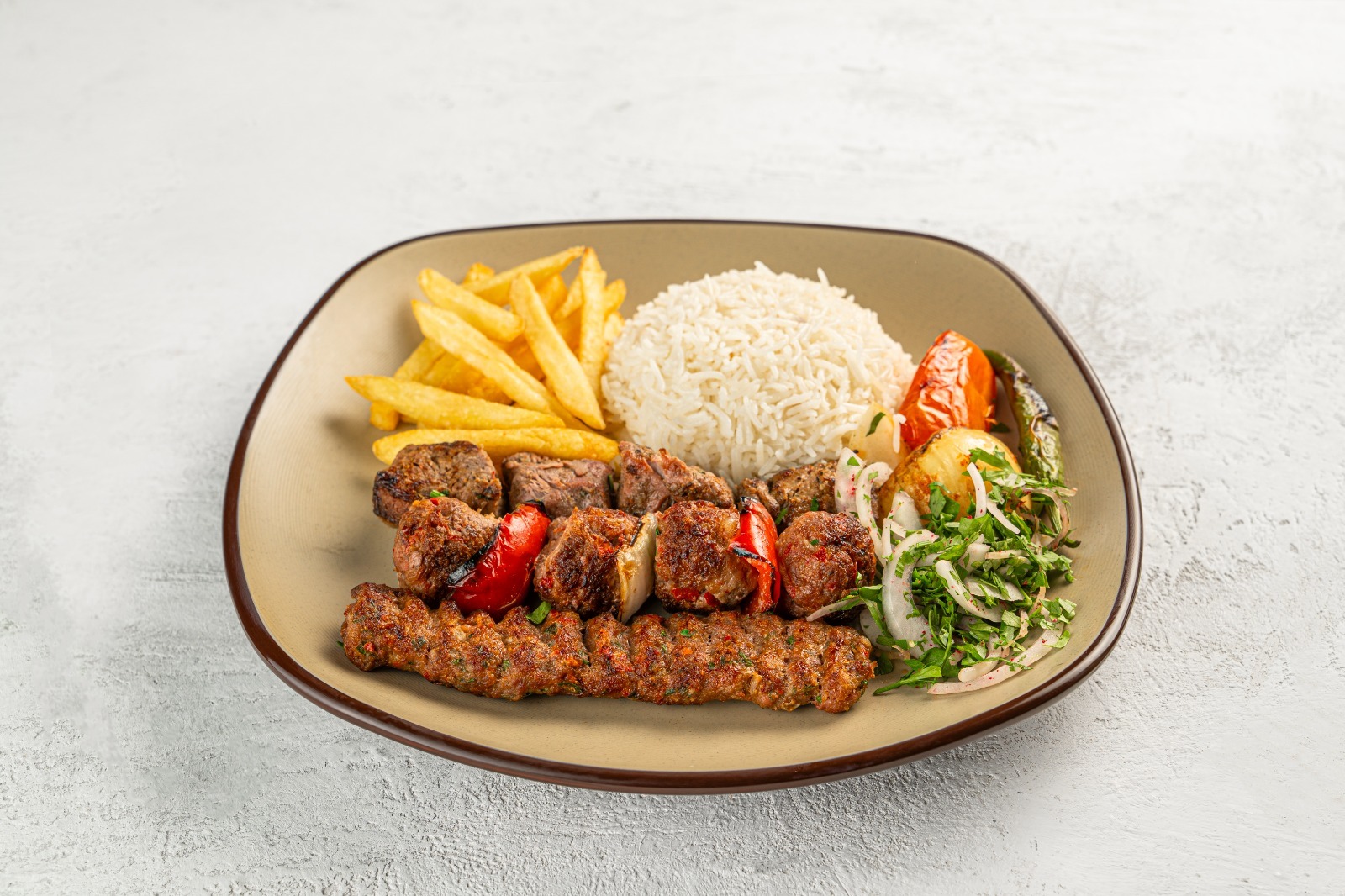 | 3 skewers (Lamb kebab, Awsal Lamb, and Grated Lamb) served with rice, French fries, and sauces