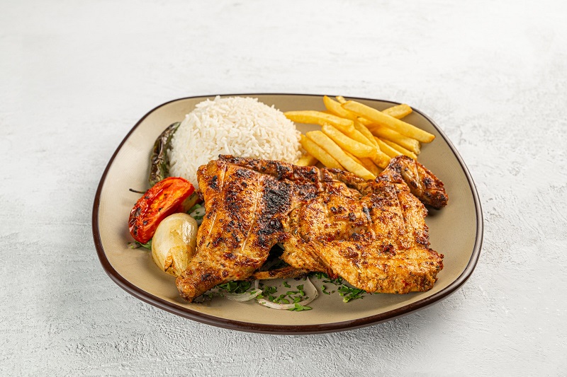 حبة دجاج على الفحم تقدم مع أرز أبيض وبطاطس مقلية