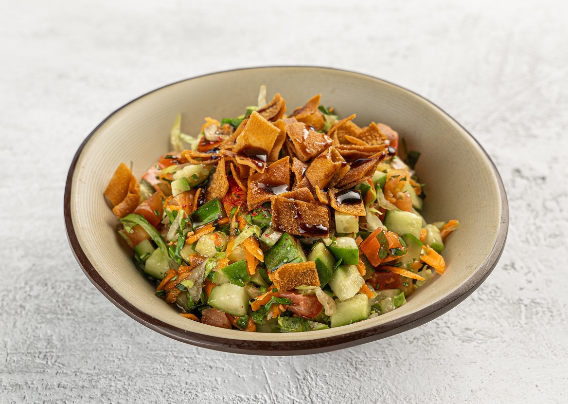قطع خبز محمص مع خضار مشكلة وليمون طازج